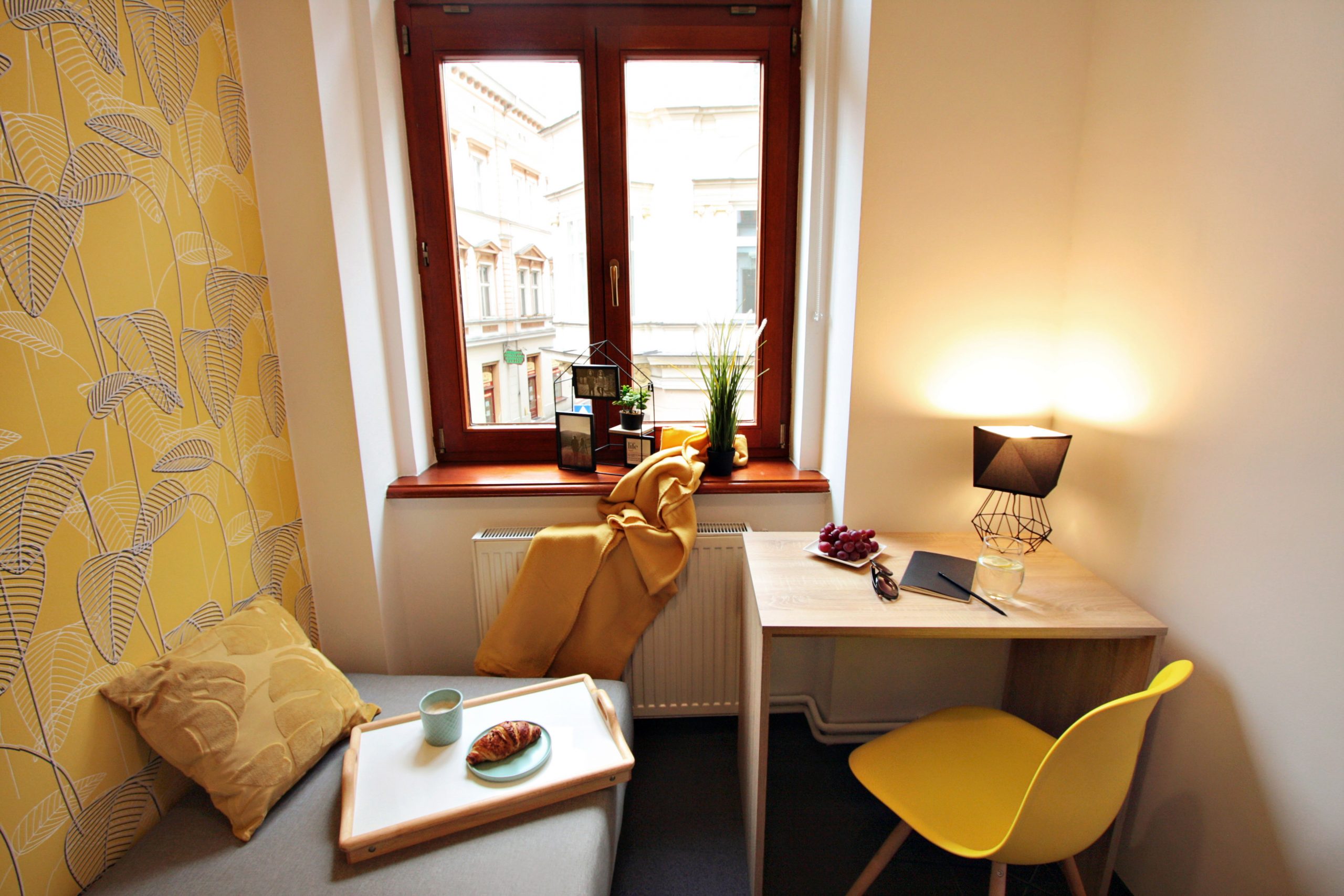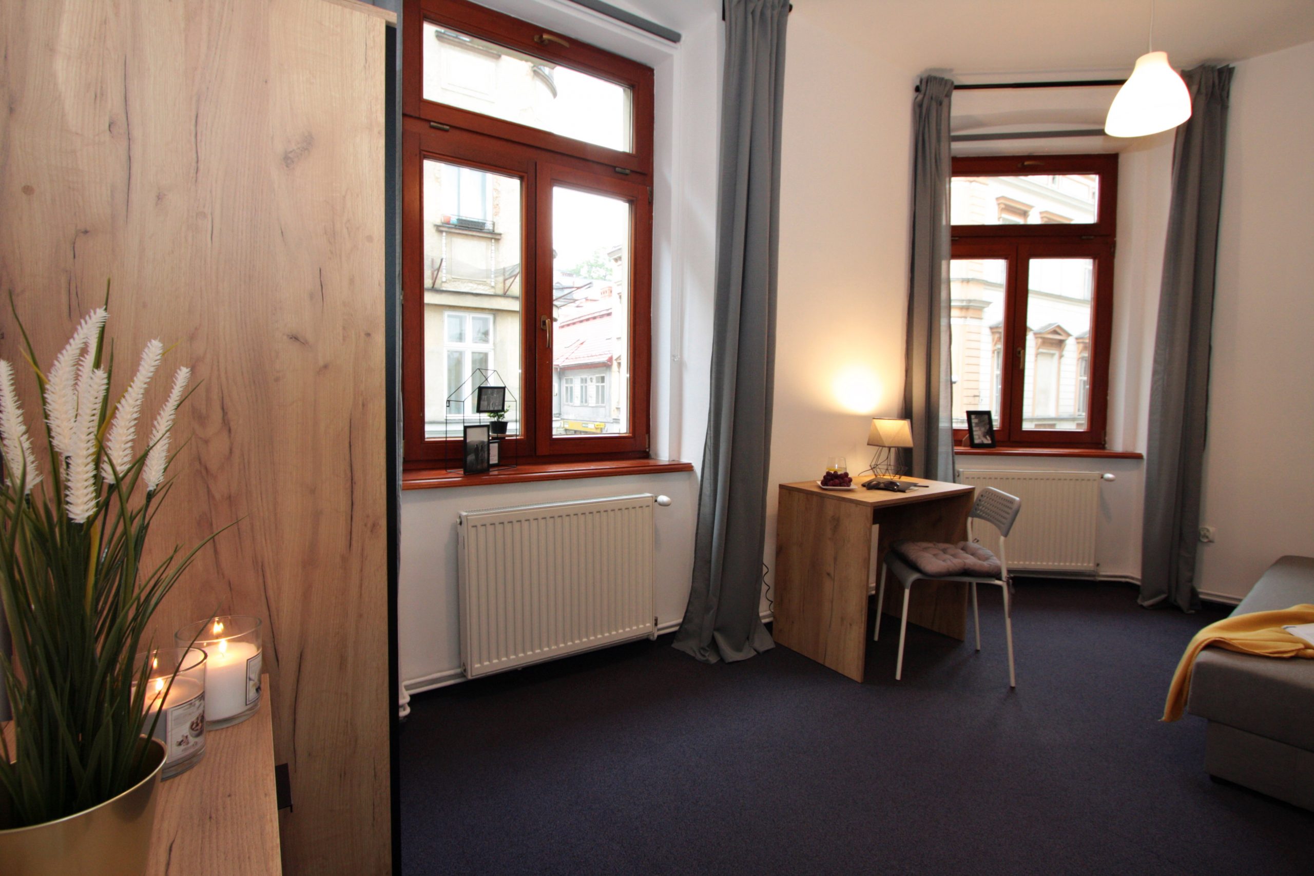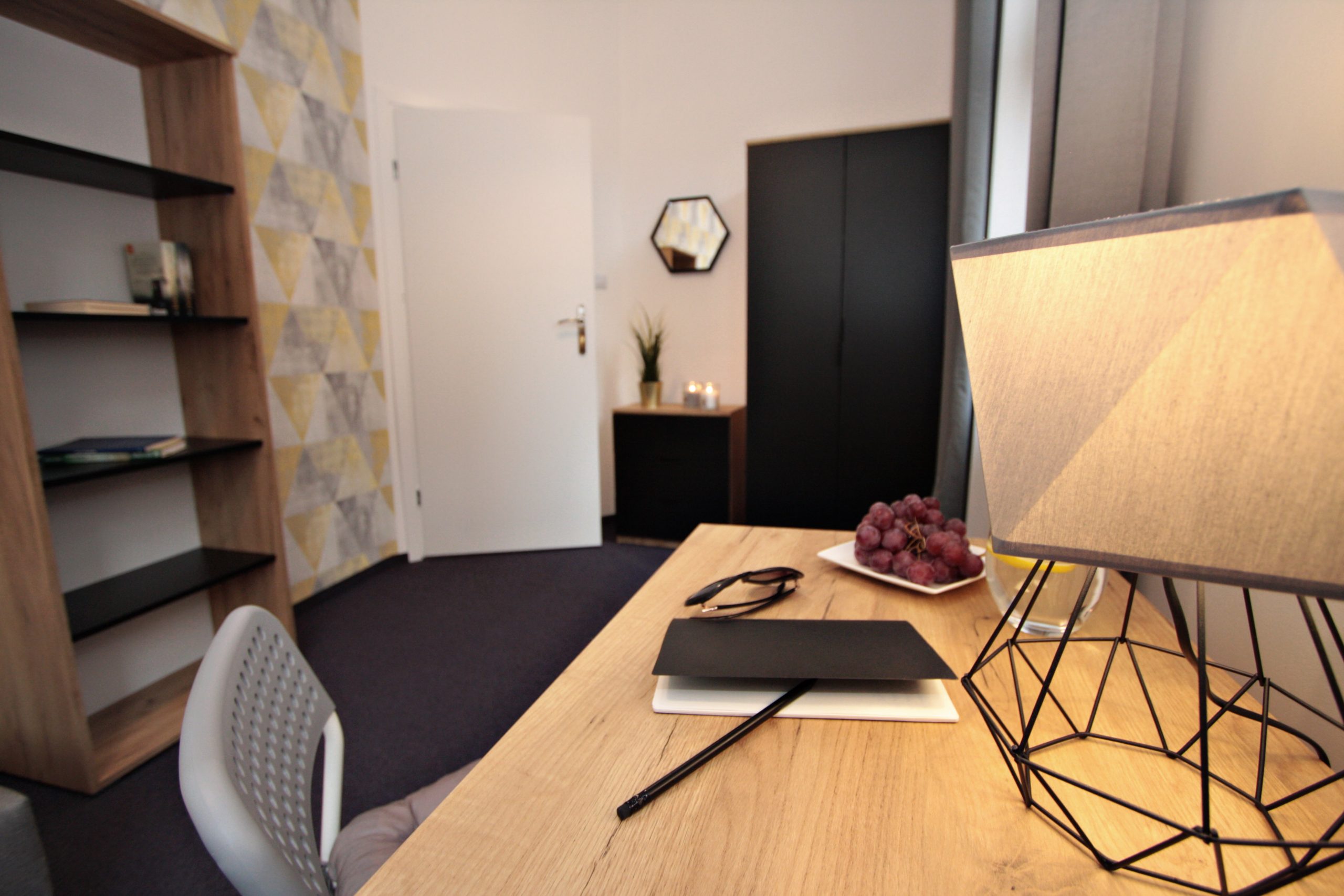 Mieszkanie składa się z sześciu dużych jednoosobowych pokoi urządzonych w wysokim standardzie. Każdy z pokoi jest zamykany na klucz. W skład części wspólnych wchodzą: dwie łazienki z prysznicami, przedpokój, kuchnia z miejscem do zjedzenia posiłków lub wypicia porannej kawy.